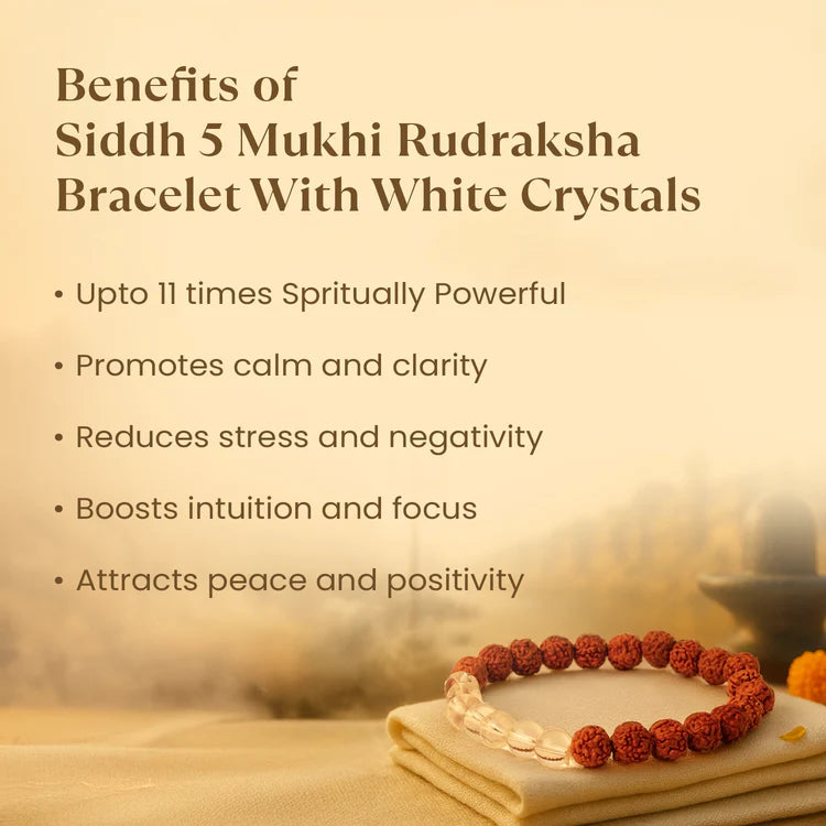 The Tirth Kashi Siddh 5 Mukhi Rudraksha Bracelet with White Crystals blends spiritual tradition with calming crystal energy. The 5 Mukhi Rudraksha is widely worn for peace, clarity, and balance, while white crystal beads are known for their soothing and harmonizing influence.